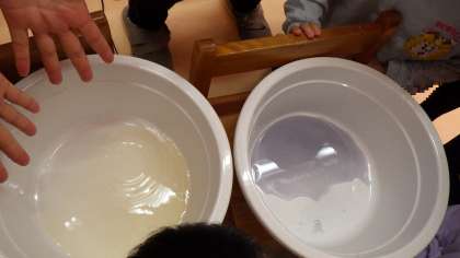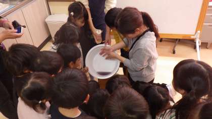 今日の手洗い指導では、魔法の薬を使ってバイキンを見てみました。
