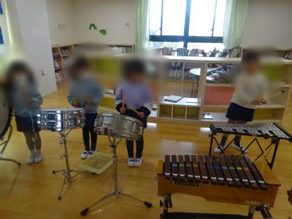 好きな遊びの時にも遊べるようにしていると、朝やお弁当後もよく楽器にふれて遊んでいる姿が見られます。