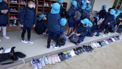 の言葉に、子どもたちはそれぞれ靴を脱いで揃えますが、中には、友達の靴も一緒に揃える子どもたちもいます。