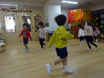 保育室では、ピアノのリズムに合わせて、歩いたり走ったり、ギャロップやスキップをしたりして遊びました。