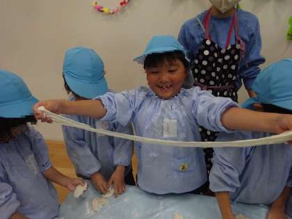「よいしょ!」と掛け声をかけながらもちをついたり、「びよーん」ともちの感触を楽しんだりして、鏡餅をつくりました。