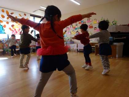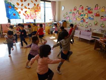歩く・走る・スキップに加えて、2学期は前けり・後ろけり・前ギャロップ・横ギャロップをしています。ピアノの音に合わせて、体を動かして楽しんでいます。