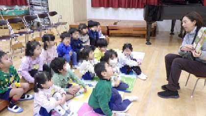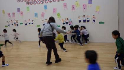 遊戯室でスキップをしたり、ケンパーをしたりして遊びました。リズムに合わせて動いたり、とまったり。動くのも楽しいですが、ピタッと止まる動きも大好きでとても楽しそうです。そのあと遊戯室で今日は絵本を聞きました。