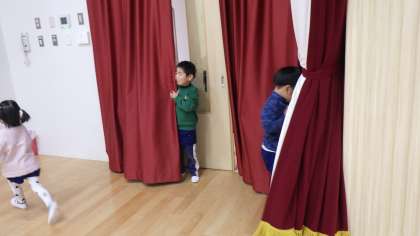 (写真1)絵本の中の動物がおいかけっこ(写真2)やかくれんぼをしていたので、ほし組さんもみんなでしてみることに。「1,2・・」数え始めるとキャーと嬉しそうに大慌てで隠れました。(写真3)みんなで寄り添って隠れている姿がとても可愛いかったです。
