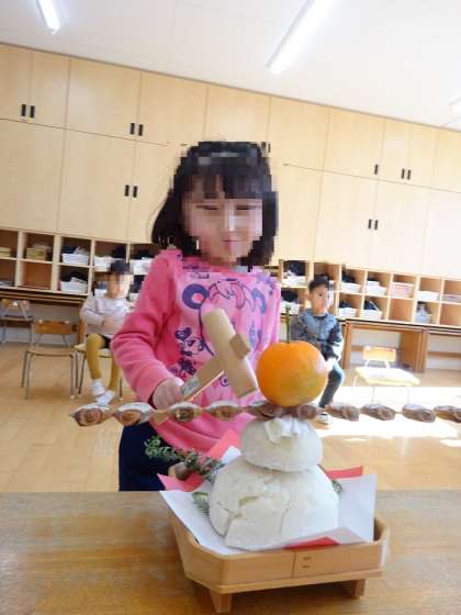 鏡開きをクラスごとにしました。鏡餅を木槌で割って1年間の無事をお願いします。子ども達も餅を叩いて一人一人やりました。