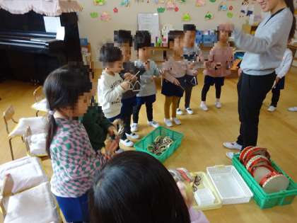 楽器遊びをしました。新しい楽器ウッドブロックに触れました。持ち方を知り、叩くと右側と左側で音が違うことにも気付きました。楽器ごとに順番に叩くことをし他の楽器の時は待ち、友達の鳴らしている音を聞いています。