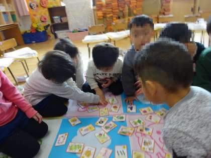 かるた取りをしました。みんな真剣な表情で絵札に見入っています。読み上げるとさっと手を出して触っています。「取れた〜」と嬉しそうです。友達と同時だっだら、ジャンケンで決めています。「もっとやりたい〜」という声が聞こえていました。