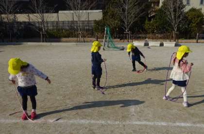 戸外では、縄跳びにチャレンジしたり、2学期から楽しんでいたバナナ鬼をしたりして遊んでいます。冬休みの間に遊んでいた子もいたようで、「走り跳びがたくさんできるようになったよ」「冬休みに○○回跳んでん!見てて」と嬉しそうに見せてくれていました。