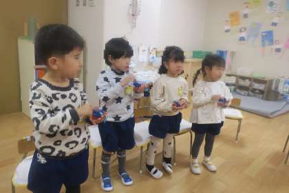 楽器遊びにも取り組んでいます。今までは同じ楽器ごとに鳴らしていたのですが、友達と交代しながら交互に鳴らすことにもチャレンジしています。