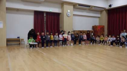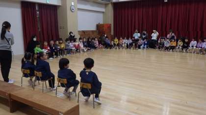 5歳児は学級休業で、4歳児と3歳児の誕生会でしたが、4歳児が司会でリードしながら楽しんでいました。