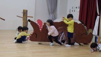 4歳児のほし組が遊戯室で表現遊びからの劇遊びを楽しんでいました。