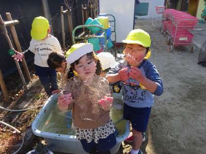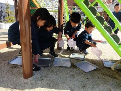 今朝幼稚園に登園すると、真っ先に自分の置いた水の場所に確認しに行く子どもたち。