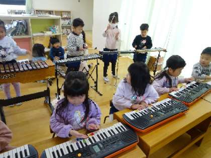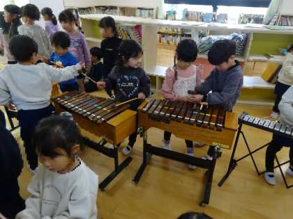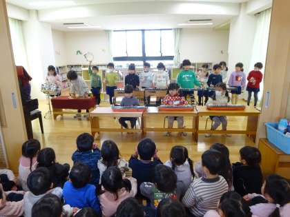 今日は4歳児の子どもたちが、年長さんの合奏をもう一度聞きたい!と2階の保育室へと遊びに行きました。