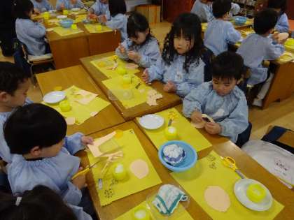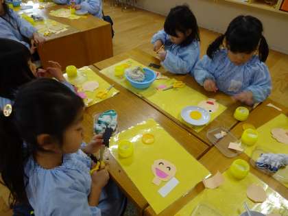 そのうえで、ハサミや糊の扱いが上手になってきているので、自分なりに目の形を工夫したり、髪型や髪飾りを工夫してみたり、と細やかなところまで考えてつくっていました。
