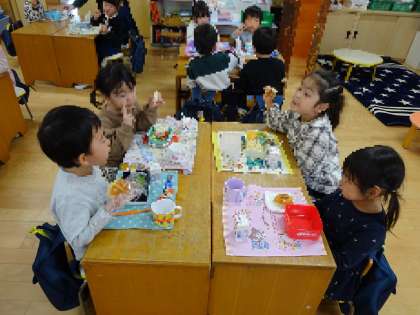 せっかくなので、ほし組とゆき組のペアで食べる日もつくり、学年としていろんな友達との関わりをもてるようにしたいと思っています。