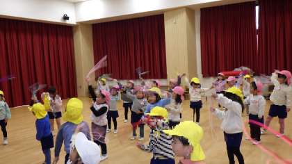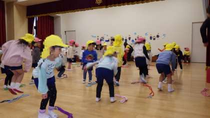 まずは縄に親しみをもってもらおうと、縄を左右にふってみたり、ヘリコプターみたいに回したり、縄をおいてジャンプしたりしました。いつもと違う縄の遊び方に「おもしろい」と楽しんでいました。最後は大繩にもチャレンジしました。みんなで一緒に遊ぶとより一層楽しみも増しました。