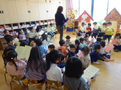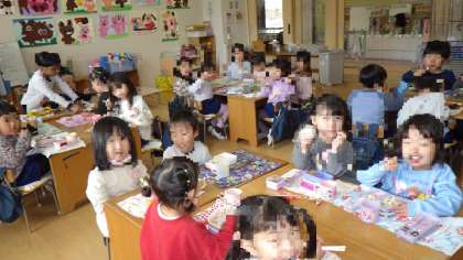 「いろいろな友達と弁当を食べよう」と友達のマークカードを作りました。全員のマークが付いているカードを持って、「〇〇ちゃん一緒に食べよう」「○○くん一緒に食べる」という声が聞こえています。一緒に食べる友達のマークに自分で〇を書きます。