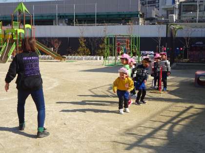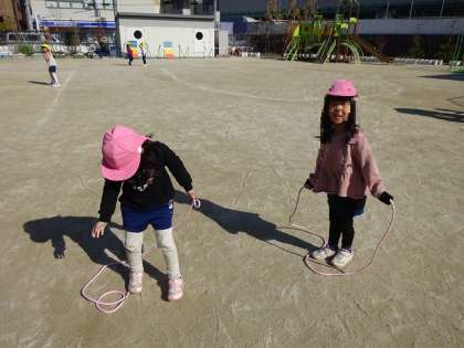 大繩では順番にひとりで跳んだり、友達と合わせて2人や3〜4人で跳んだり挑戦しています。何回か跳べた時の満足感や達成感を感じている姿が見受けられました。