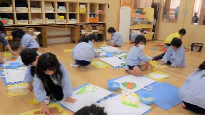 今日は年度末に持って帰る作品袋に装飾をしました。