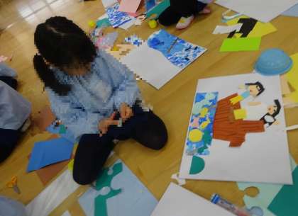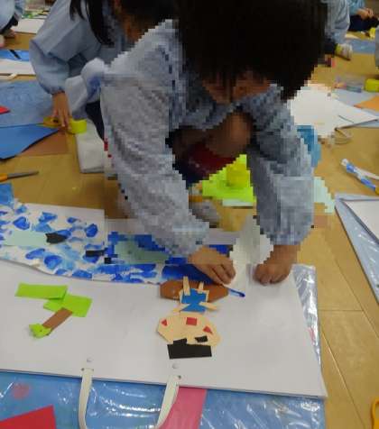 作品袋にわんぱくだんの製作を貼ったり、自分で船や怪獣をつくったりして素敵な作品袋が完成しました。これまでの製作の経験から、自分でいろいろなことを考え、丁寧につくる姿が見られました。ここに1年間の作品を入れて持ち帰ります。楽しみにしていてくださいね。