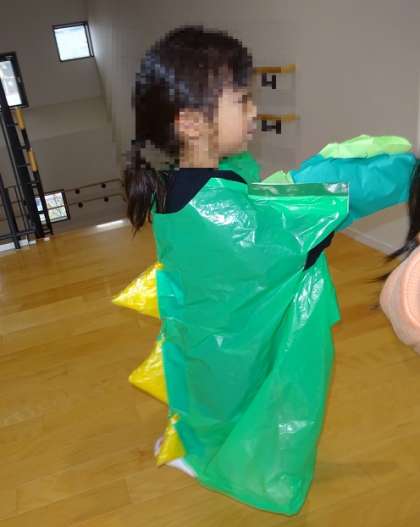 また、廊下で、そら組さんの生活発表会の劇遊び「わんぱくだん」の衣装を見つけました。そら組のお部屋まで「使ってもいい?」と先生に聞きに行くと、「いいよ」と言ってもらって、「みんなー!これ使ってもいいって!」と友達にお知らせしてくれました。衣装を着けて「いちご組のわんぱくだんごっこ」が始まりましたよ。