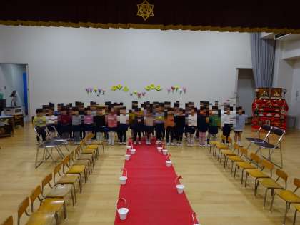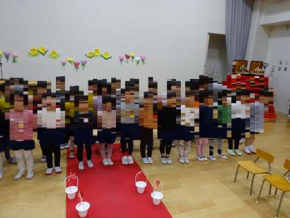 修了式に在園時のお祝いの言葉と歌での練習を本番と同じように入退場から遊戯室で練習しました。