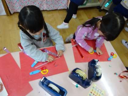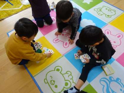 雨の日は雨の日で、楽しい遊びを保育室でしています。
