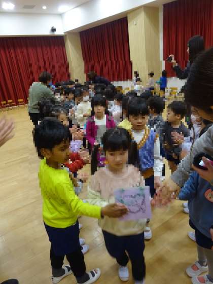 先日お別れ会がありました。小さい組さんから素敵なプレゼントをもらい、そら組も思わずにっこりと、嬉しそうな表情をしていました。
