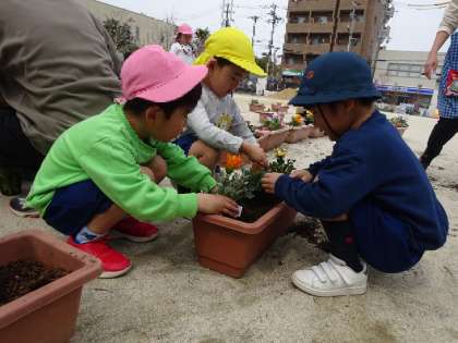 修了式に向け、園庭が華やかになるよう、今日は4歳児でお花の苗を植えました。