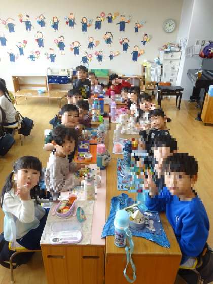 幼稚園で食べる最後のお弁当でした。毎日子どもたちはお家の方からのお弁当を楽しみにしており、食べると「おいしい」「好きなものがはいってる」と嬉しそうに食べ、お家の方からの愛情を受け取っていたのではないかと思います。そして友達と一緒に食べることも毎日楽しみにしており、笑い合いながら食べていました。最後も全員ピカピカにして帰っています。毎日のお弁当づくりありがとうございました。