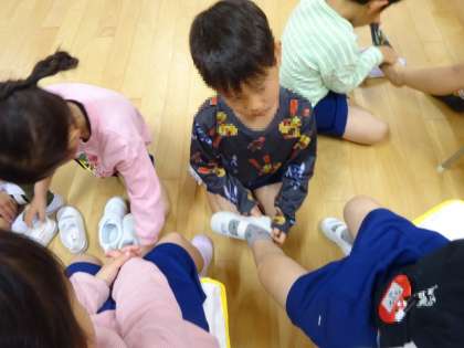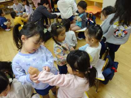 お兄さん、お姉さんが来てくれて、嬉しすぎて走り回っちゃったり、逆に緊張して固まってしまったり、、、いろいろな姿の3歳児さんを前に、5歳児も少し緊張の様子でした。