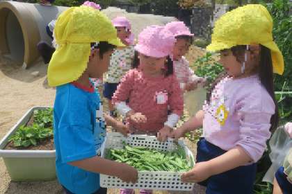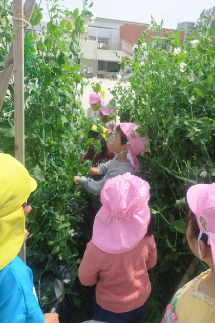 ほし組・ゆき組の子どもたちが昨年度に種をまいた、キヌサヤとスナップエンドウが大きくなりました。