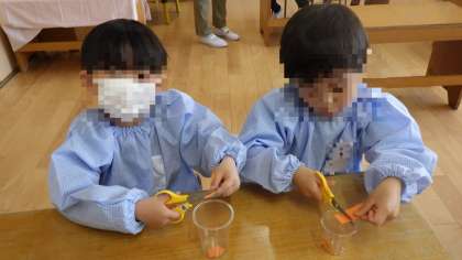 「これはオレンジジュース!」「スイカ味だよ」「氷も入れなきゃ!」と、ジュースのイメージをもちながらつくって遊ぶ姿が見られました。