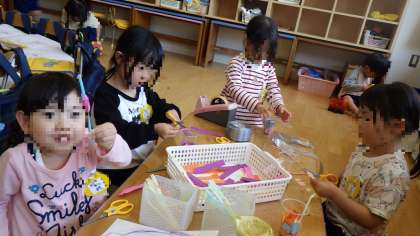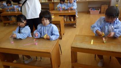 お弁当を食べた後も、「もっとジュースをつくりたい!」と、たくさんつくったり、コップに蓋をつけたり、飾りをつけたりしていました。