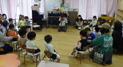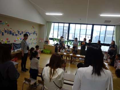 3歳児のクラスでは、保護者の方と一緒におはようをしていました。