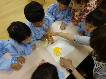 初めての絵の具遊びです。みんな自分の好きな色を選び、手に絵の具を付けてもらうと、紙にぺったん!