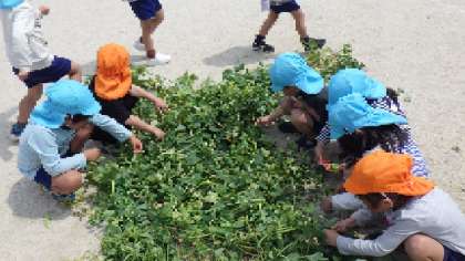 キヌサヤの根ごと抜いて地面に広げると、葉がいっぱいの絨毯のようになりみんな大喜び!そこからみんなでキヌサヤを探して収穫しました。