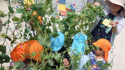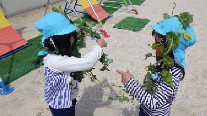 収穫後はキヌサヤの茎をトンネルにして中を通ったり、首に巻いて遊んでいました。