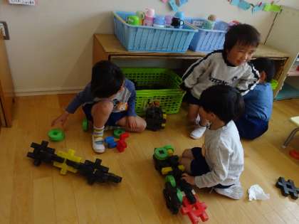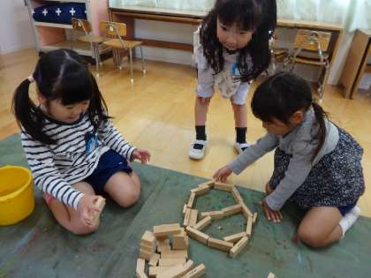 先生がそっと積み木を横に置いておくと、それでお家づくりが始まっています。