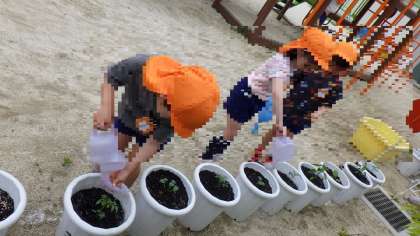 野菜の苗に水やりをしています(5歳児)