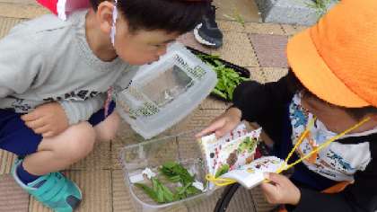 お掃除が終わり、新しい葉っぱを入れると元気に動き出した幼虫もいて、幼虫も子ども達も一緒に喜んでいるようでした。