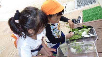 小さい図鑑を見ながら幼虫を観察し、「このチョウになるんかな〜」「(幼虫の体が)鳥のうんちみたいな色」など気付きもたくさんあったようです。