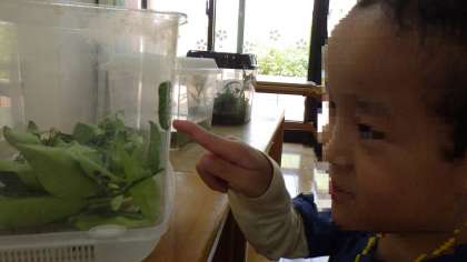 子どもたちが毎日観察しているアオムシも、少しずつ大きくなっています。