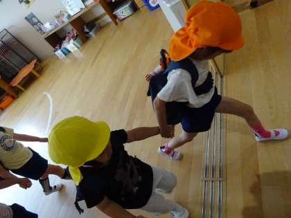 「電車に乗るよ〜、大きく一歩」と実際に電車に乗ったイメージで遊んでいました。