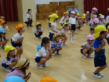 広い遊戯室で大好きな虫が出てくる「昆虫太極拳」の体操をみんなでしました。