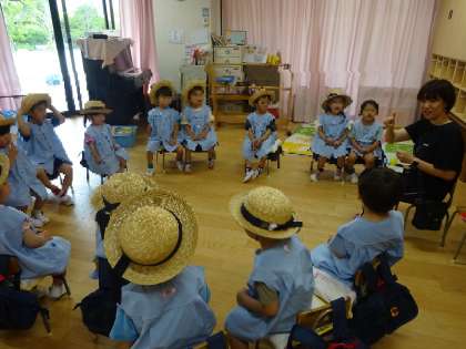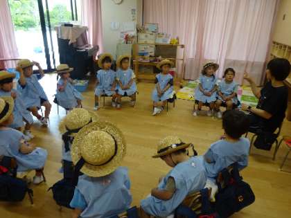 3歳児では、明日の幼稚園に期待がもてるよう、明日の活動をお知らせしていました。