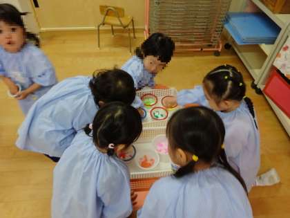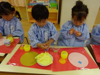 教師が小さなカップを用意すると「お買い物♪」といろいろな色紙を選んでいることを楽しんでいる姿が見られました。