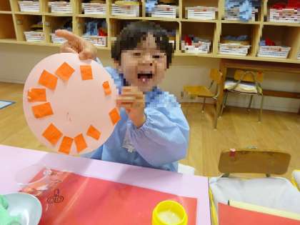 同じ色の紙を何枚も貼っている子、用意した全部の色を色をまんべんなく貼る子、貼り方を考えて貼る子、一人一人全員が違っていてとてもおもしろかったです。