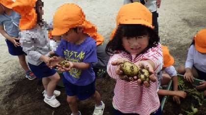 そら組、つき組が4歳児の時に植えたタマネギ、ジャガイモを収穫しました。大きく立派なタマネギ、土の中からかわいらしく出てきたジャガイモ。「このふたつの野菜でカレーできる!」「お家で料理する!」と、楽しみにしていました。