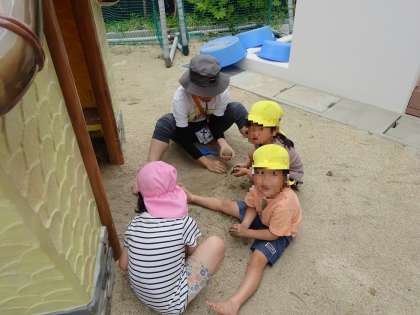 「カレーです」「コーヒーつくってあげる!」と、お皿や容器に入れ、ごちそうをつくったり、「硬くなってきた!」「温かい砂かけよう」と話しながらだんごをつくったりしました。